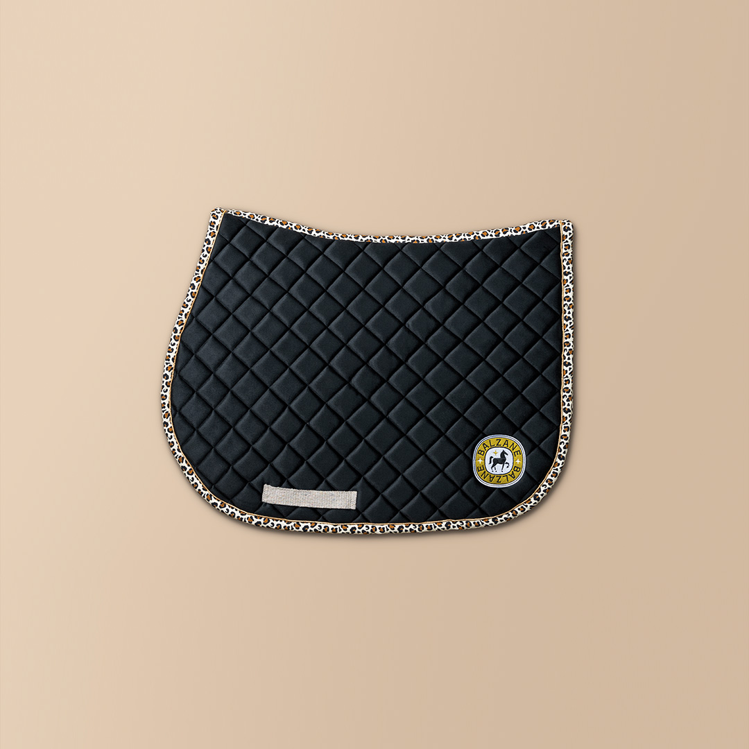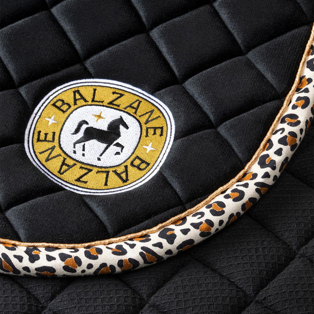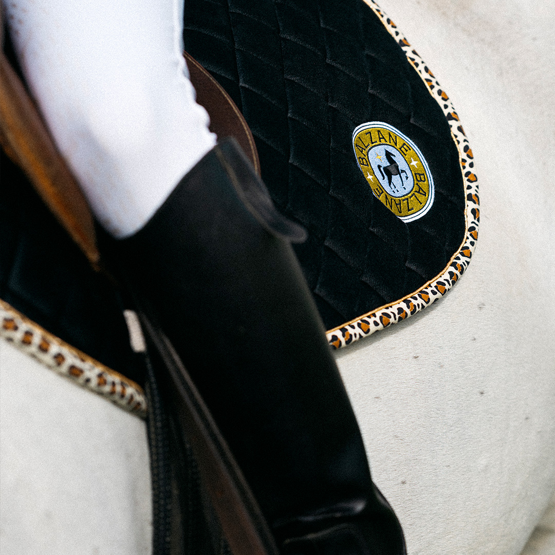 Le tapis Balzane léopard noir incarne l’élégance absolue. Son velours profond et intense, réhaussé d’une bordure à l’imprimé léopard sauvage, créé une pièce audacieuse et tendance. Le passepoil doré, signature de l’atelier Balzane, en révèle toute la noblesse. Une pièce intemporelle dans votre sellerie.