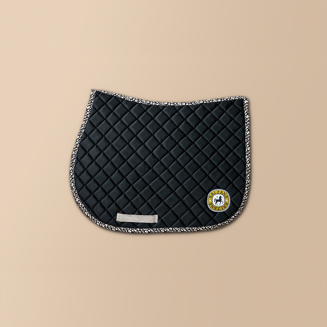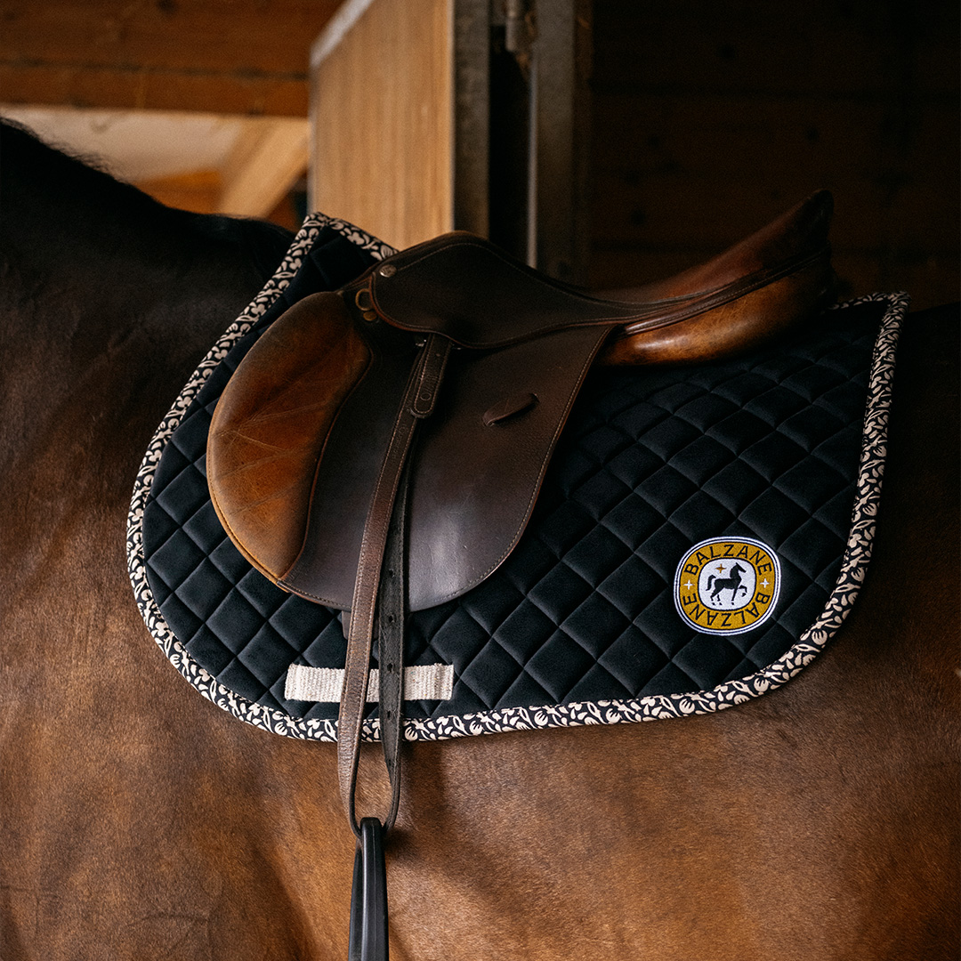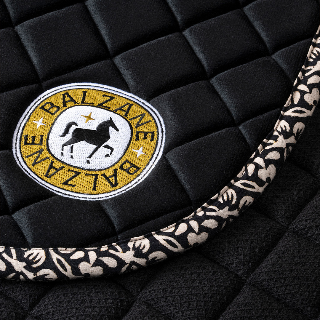 Chaque tapis Balzane est pensé comme une pièce unique, où technicité, élégance et savoir-faire artisanal se rencontrent. Velours haut de gamme : le dessus du tapis est confectionné en velours doux et résistant, apportant un toucher luxueux tout en restant adapté à l’effort. Bordure imprimée exclusive : chaque tissu de bordure est imprimé spécialement pour Balzane, avec ce motif unique qui affirme le caractère de la marque. Passepoil doré : inspiré des parures et saris indiens. Détail précieux et délicat. Sangle artisanale : confectionnée à la main, elle est ponctuée de fines touches colorées et dorées. Doublure en nid d’abeilles : très absorbante, elle permet d’évacuer rapidement la transpiration pour un confort optimal lors de l’effort. 100% coton, elle assure un contact sain avec le dos du cheval. Mousse intérieure : moelleuse mais stable, elle offre un excellent amorti sans compromettre le contact avec la selle. Sac Balzane, assorti et brodé pour que Balzane ne vous quitte jamais. Coupe anatomique pour libérer le garrot et la ligne dorsale. Un tapis à la fois fonctionnel, confortable et singulier, pensé pour sublimer chaque monte. Un lien respectueux entre vous et votre cheval.