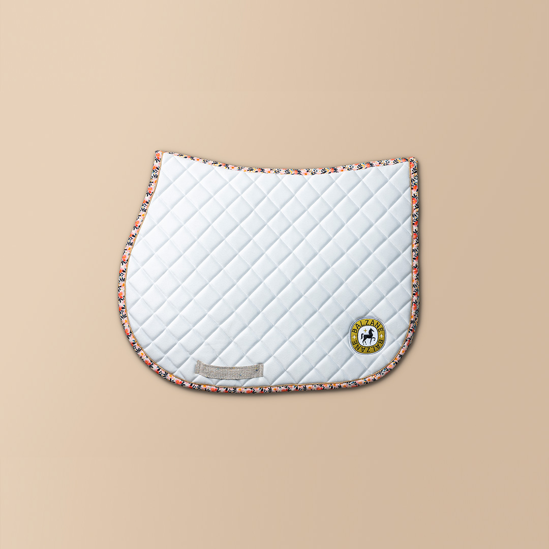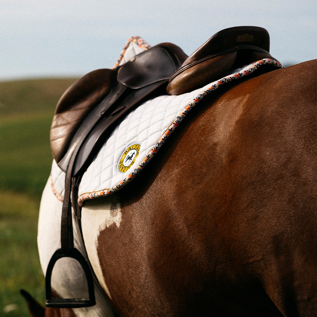 Le tapis de selle Victoire illuminera votre couple avec son velours blanc étincelant. Une délicate bordure de petites fleurs colorées romantiques réhausse cette pièce. Le passepoil doré Balzane vient parfaire l’ensemble avec éclat. Un tapis chic et vibrant, pour les grandes occasions. Le choix de Brune pour les dimanches de concours.